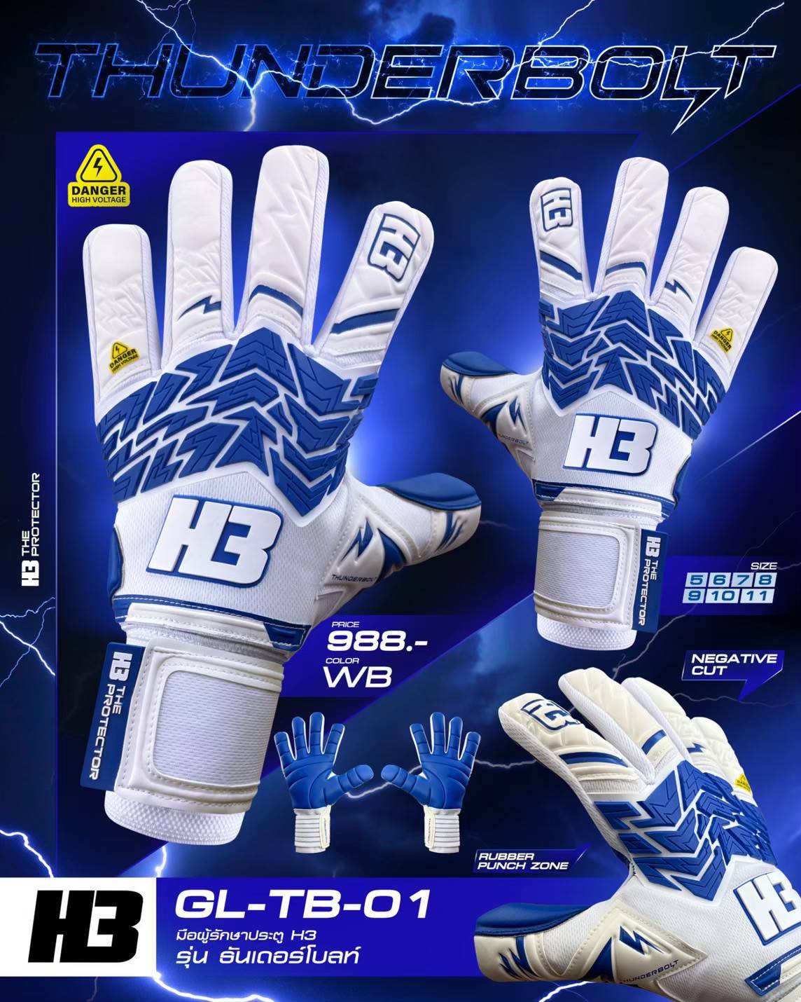 H3 ถุงมือรุ่น TUNDERBOLT WB ขนาด 8 สี ขาว/น้ำเงิน